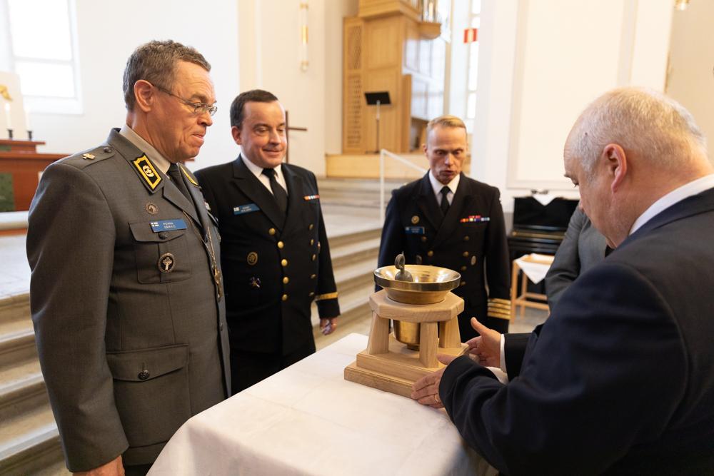 Rannikkoprikaatin sotilaspastori Henri Kivijärvi (keskellä) on päättänyt tehdä kaikkensa tuodakseen laivakellojen perinteet takaisin Suomeen. Vasemmalla kenttäpiispa Pekka Särkiö ja oikealla kommodori Juhapekka Rautava. Kuva: Eino Rissanen
