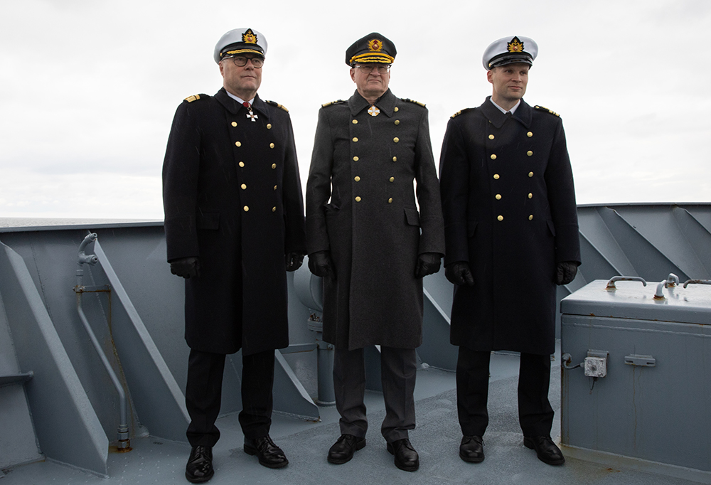 Tilaisuutta kunnioittivat läsnäolollaan Merivoimien komentaja, kontra-amiraali Tuomas Tiilikainen (vas.), kenraaliluutnantti (evp) Mikko Heiskanen ja kapteeniluutnantti Olli-Petteri Heiskanen. Kuva: Eino Nevalainen
