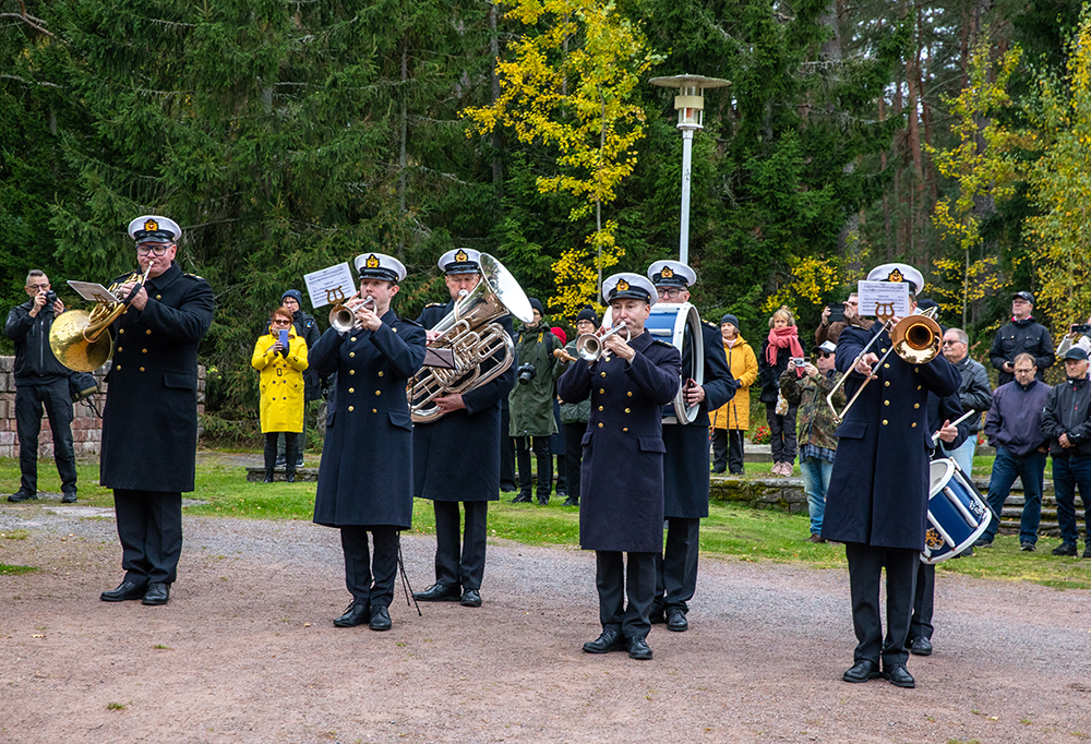 Meritilaisuuden jälkeen laskettiin seppeleet myös Reposaaren kirkon pihassa sijaitsevalle torpedovene S2:n uhrien muistomerkille, jossa esiintyi laivaston soittokunta. Kuva: Eino Nevalainen