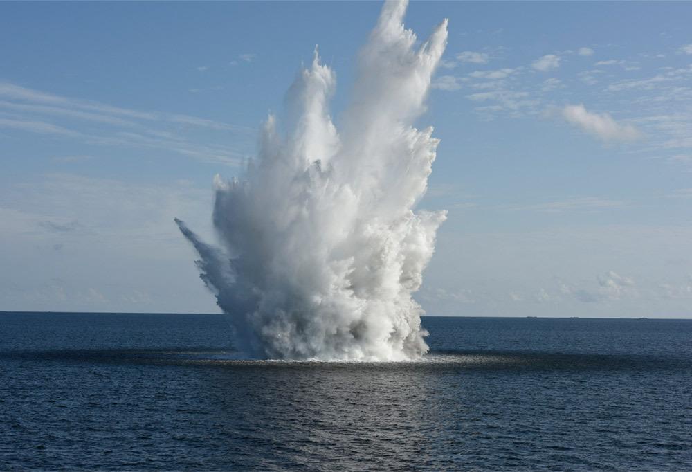 Miinan räjähtäminen lennättää vettä korkealle ilmaan.