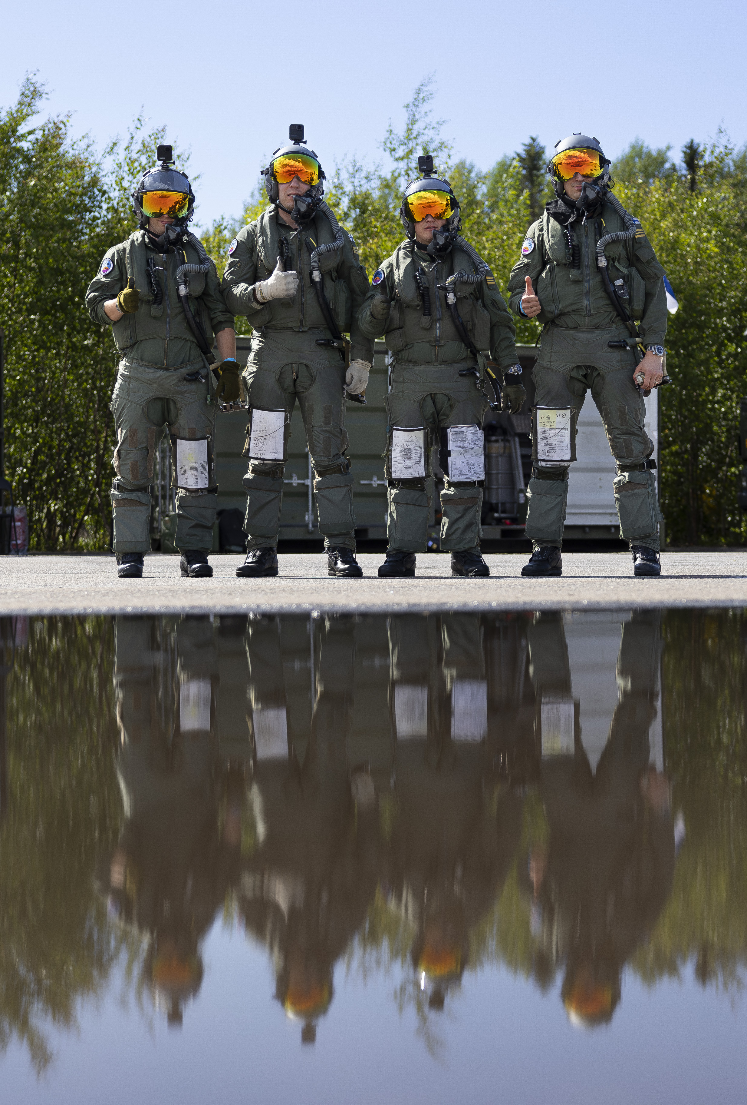 Kapteeni Petteri Wahlgren, #4, pukee päälleen täyden varustuksensa. Taitolento on vaativa laji, jota kukaan ei tee muuten vaan. Kuva: Oskar von Essen