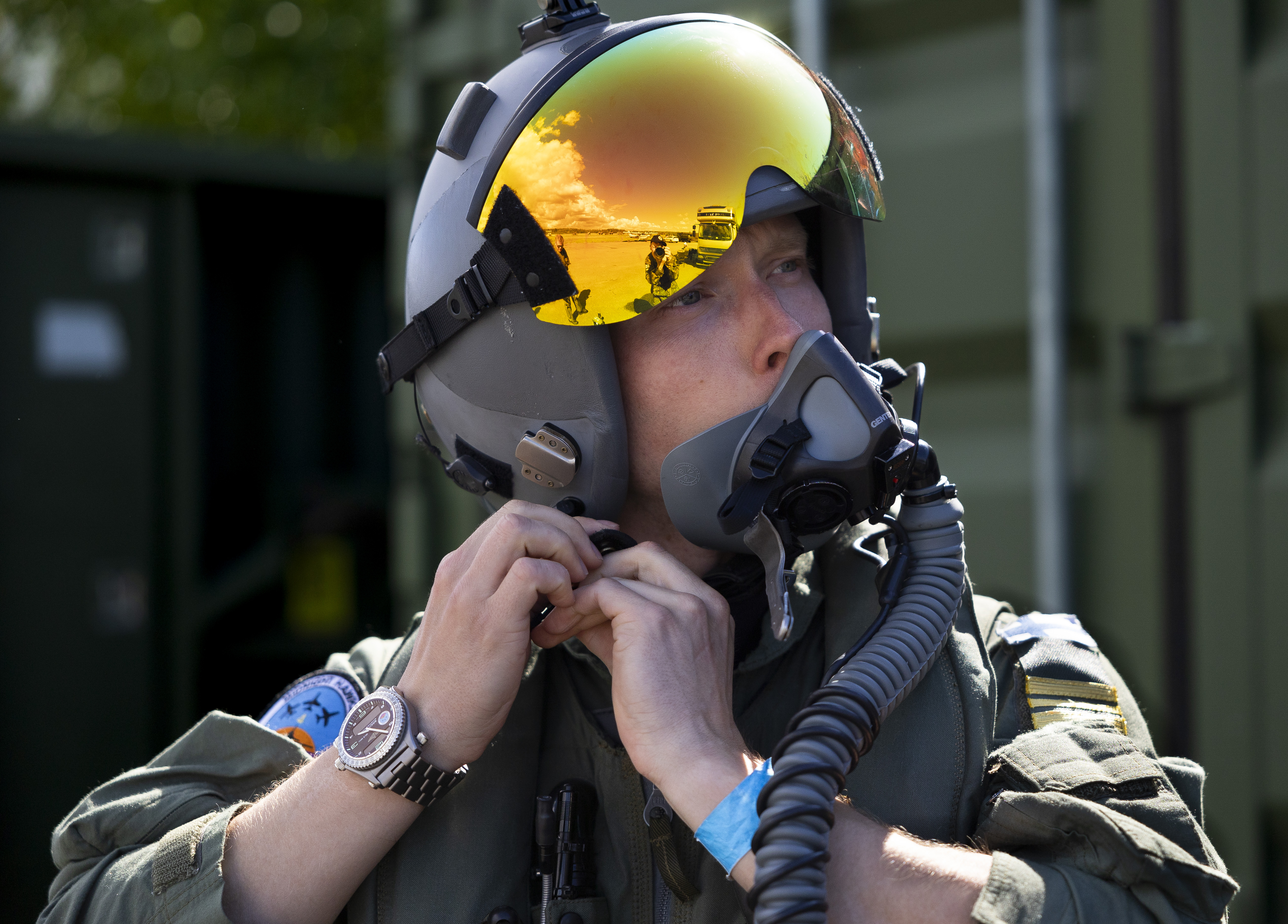 Viimeiseksi lentäjät pukevat kypärät. Toisin kuin muu vihertävä varustus, kypärä ja siihen liitoksissa oleva hengitysnaamari ovat teollisen harmaat.