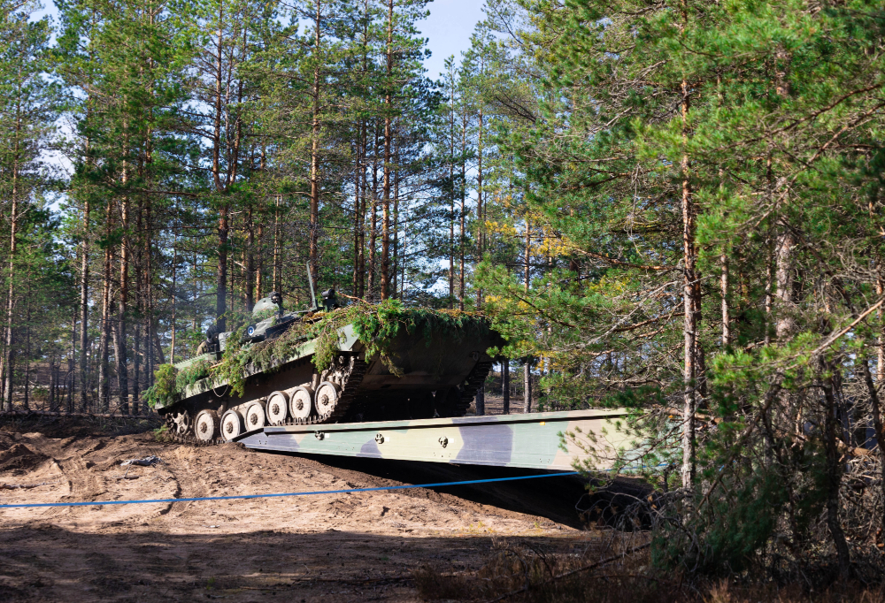 Lopulta 1 500-hevosvoimainen rautahirviö pakittaa vauhdilla suojaan harjanteen taakse. Ensimmäinen liki 60 tonnia painava Leopard-taistelupanssarivaunu ajaa sillalle ja lähtee etenemään sitä pitkin. Telojen ja sillan urien väliin ei jää monta senttiä tilaa.