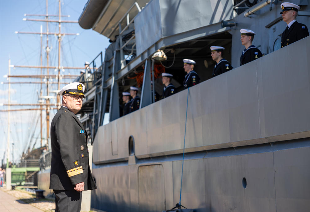 Merivoimien komentaja, kontra-amiraali Tiilikainen tarkastaa laivan ja sen miehistön. Kuva: Elias Harinen