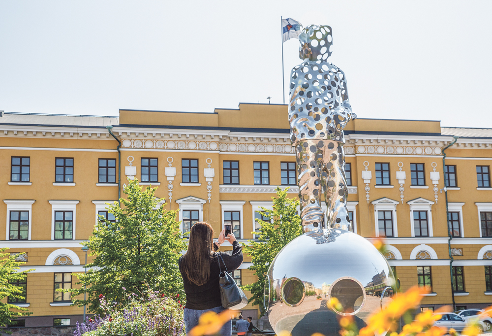 Kaupungilta löytyvät maanpuolustusaiheiset muistomerkit saavat miettimään omaa maanpuolustussuhdettaan. Kuvassa Helsingin Kasarmitorilta löytyvä Talvisodan kansallinen muistomerkki, Pekka Kauhasen Valon tuoja.