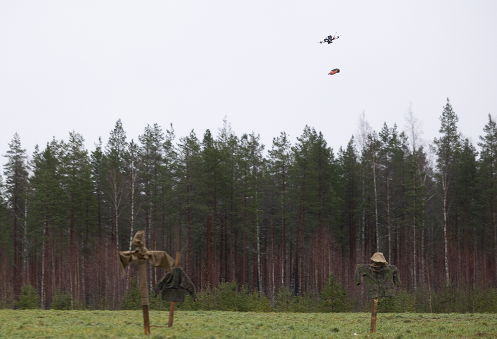 Lennokki nousee ilmaan nopeasti. Kun se on päässyt tavoitekorkeuteen, drooni jatkaa suoraan eteenpäin. Pian droonin lennättäjä näkee kohteen keskellä avointa kenttää.