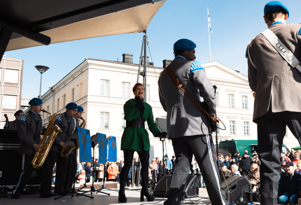 Varusmiessoittokunnan Showband viihdytti toriyleisöä Kansallisen veteraanipäivän pääjuhlassa 27. huhtikuuta 2025. Kuva: Eetu Kolehmainen