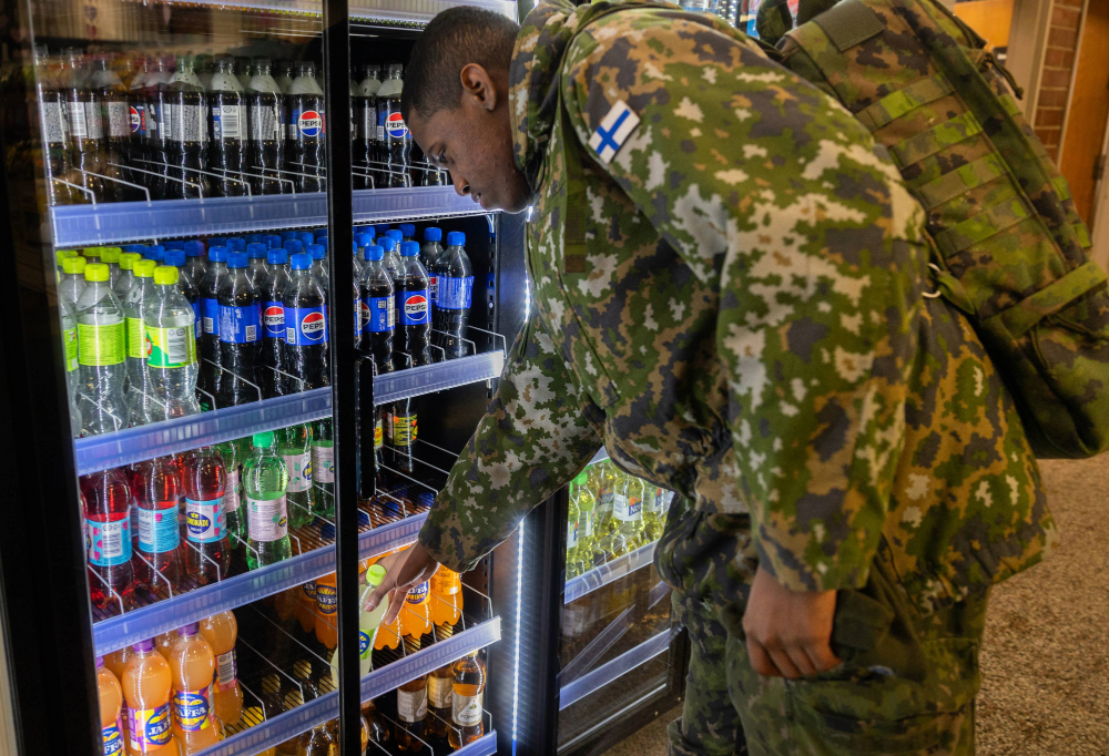 – Se on niin halpa, niin se myy siksi energiajuomista eniten, kertoo Uudenmaan prikaatin sotilaskodin toiminnanjohtaja Niclas Fransman.