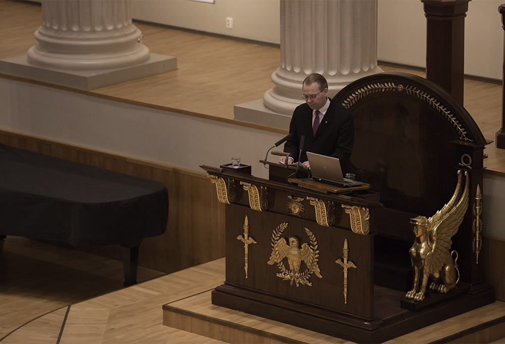 Puolustusministeri Jussi Niinistö (ps.) piti esitelmän turvallisuuspolitiikasta Maanpuolustuskurssiyhdistyksen tilaisuudessa torstaina 20. lokakuuta. Tilaisuuden ohjelmaan Helsingin yliopiston juhlasalissa kuului myös yhdistyksen kokous.