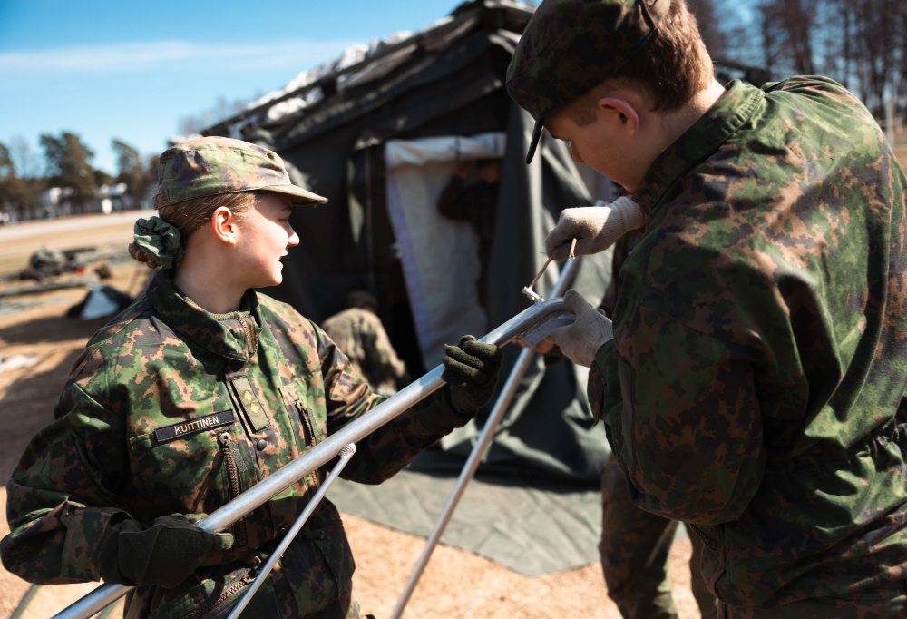 – Sitten vaan teltta uudestaan kasaan! upseerikokelas Anni Kuittinen käskee jälleen. Hänen johtamansa ensihoitojoukkueen sotilaat ryhtyvät empimättä toimeen.