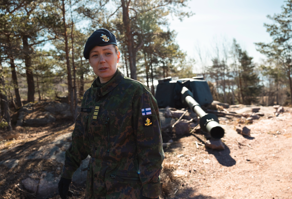 Komentaja Jenni Bäck on saanut rannikkotykkeihin koulutuksen. Taustalla oleva tykki on tornikanuuna 130 TK. Kuva: Eetu Kolehmainen