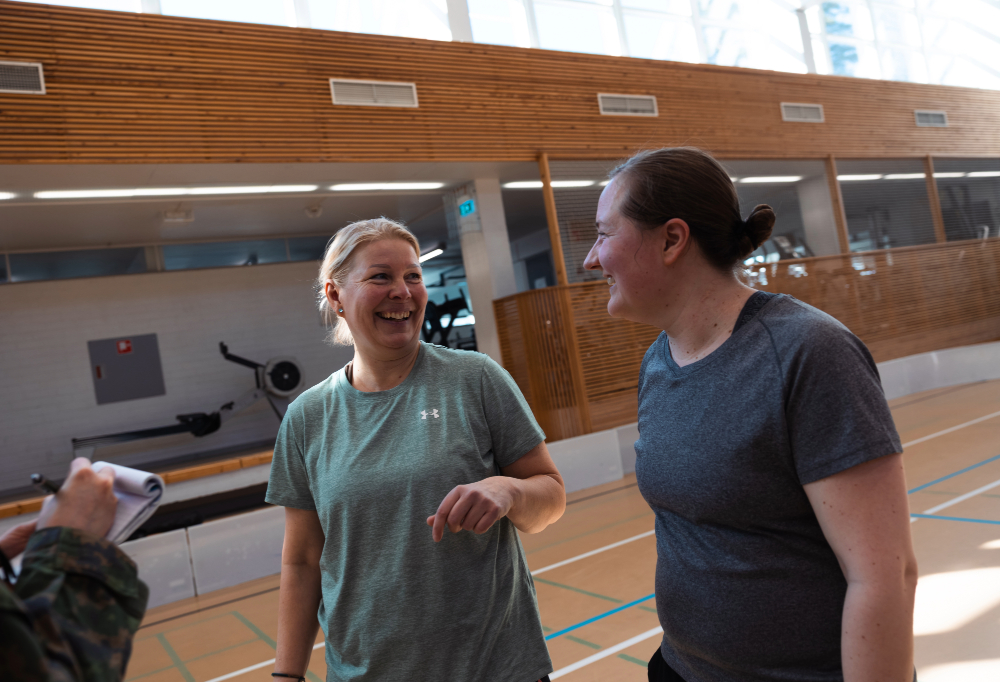 – Puolustusvoimien fyysisen toimintakyvyn tasovaatimukset ovat tasapuoliset kaikille, olipa sitten 25-vuotias mies tai kaltaiseni yli nelikymppinen kolmen lapsen äiti, jumppatuntia sivusta seuraava komentaja Jenni Bäck lisää naurahtaen. Hän on tehnyt oman kuntosalitreeninsä jo heti aamusta ennen töihin tuloa.