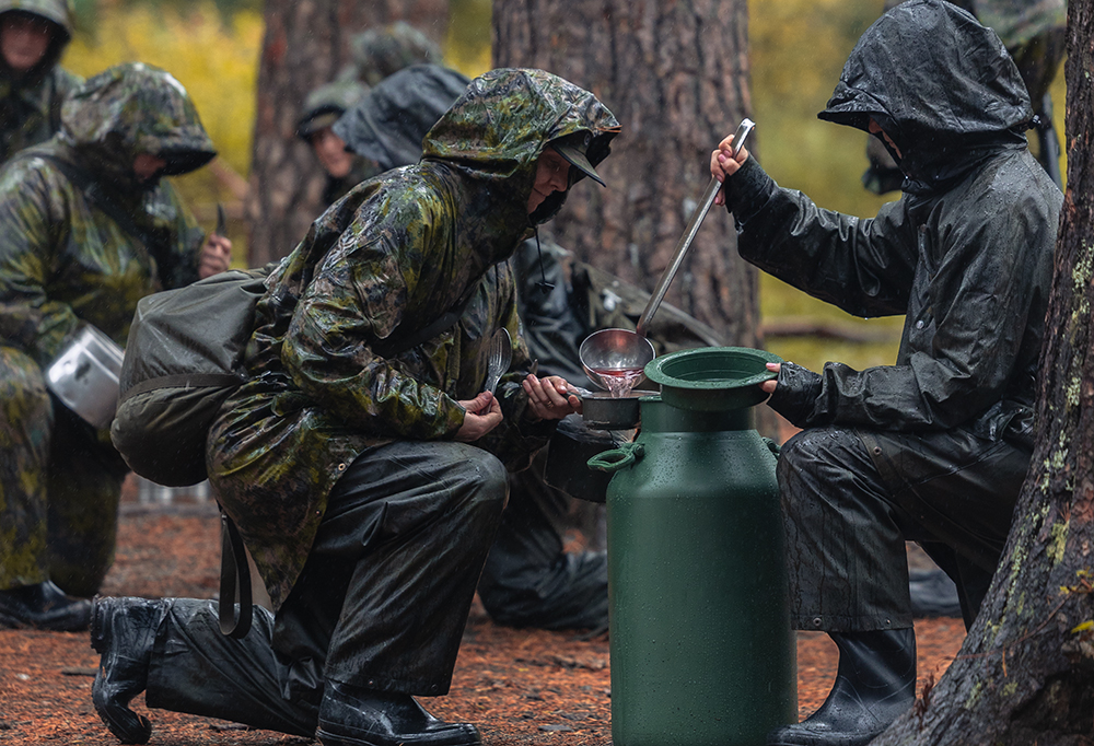 Maastoruokailussa tarjolla on nakkipataa. Se nautitaan pakeista asianmukaisesti ilmasuojassa – yksi taistelija per puu. Jälkiruoaksi on tarjolla suklaapatukka.