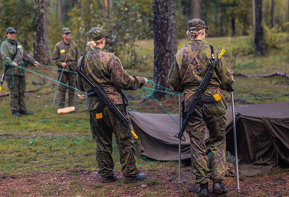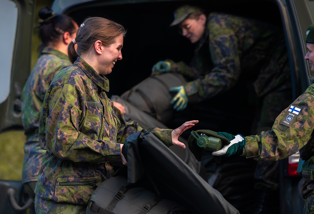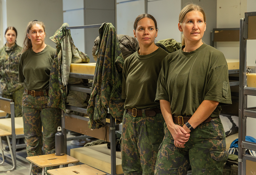 Maailmantilanne toi Anni Peltomäen (toinen vas.) Reetta Pitkäsen ja Jenni Sippolan tutustumaan armeijan arkeen. Kuva: Pauli Hytönen