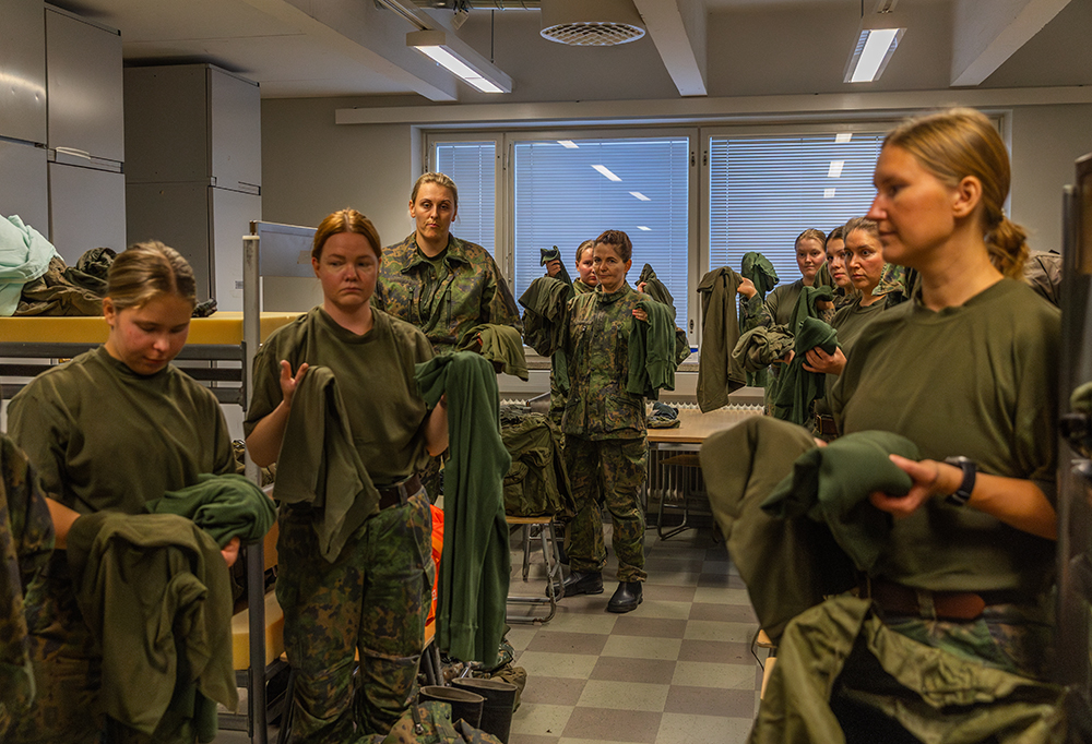 Panssariprikaatin varusvarastolla käy kuhina. Pitkin käytäviä kiemurtelee jono, jonka jatkeeksi asettuu joukko naisia. Jokaisella on iso reppu, johon he pakkaavat eri pisteiltä aina jonkin uuden varusteen. Kukin nappaa mukaansa maastopuvun, lippiksen, kenttäpullon, vyön ja viimeiseltä pisteeltä kengät.