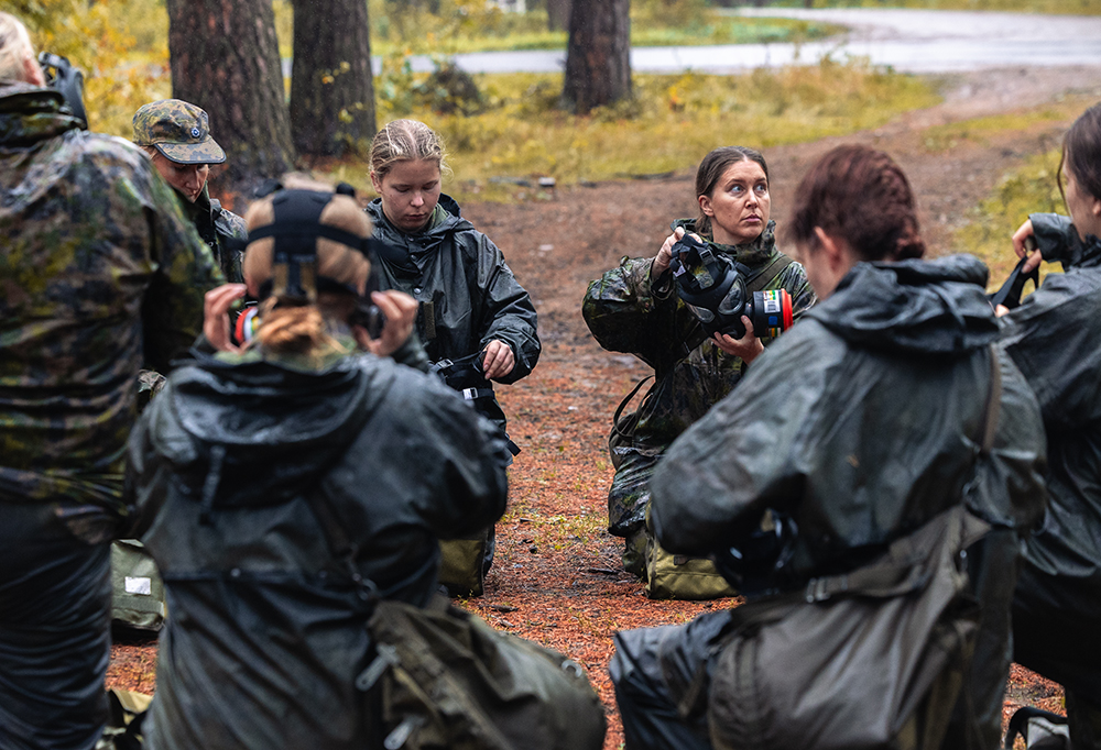 Suojeluhälytyksessä taistelijalla on kymmenen sekuntia aikaa saada kaasunaamari kasvoille. Kuva: Pauli Hytönen