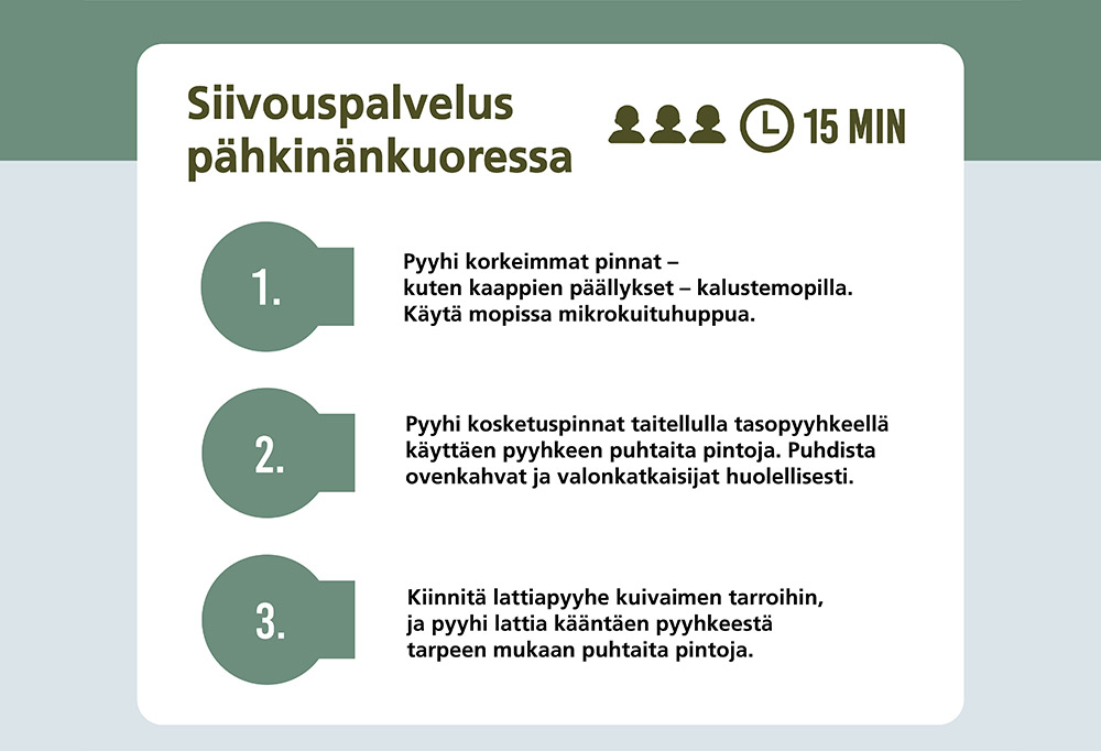 Aloita pyyhkimällä korkeimmalla olevat pinnat, kuten kaappien päällykset, kalustemopilla. Käytä mopissa mikrokuituhuppua. Älä kiipeä jakkaroiden tai sänkyjen päälle, ettei työturvallisuus vaarannu.