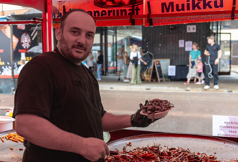 Monet ulkomaalaiset turistit sekä muusikot ovat uteliaita maistamaan turkkilaisen Cedar Sakarin myymiä muikkuja. Kuva: Patrik Vuori