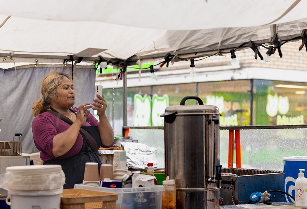 Ohikulkijoita kehotettiin tulemaan kevätrullia myyvän kojun alle pitämään rankkasadetta. Kuva: Patrik Vuori