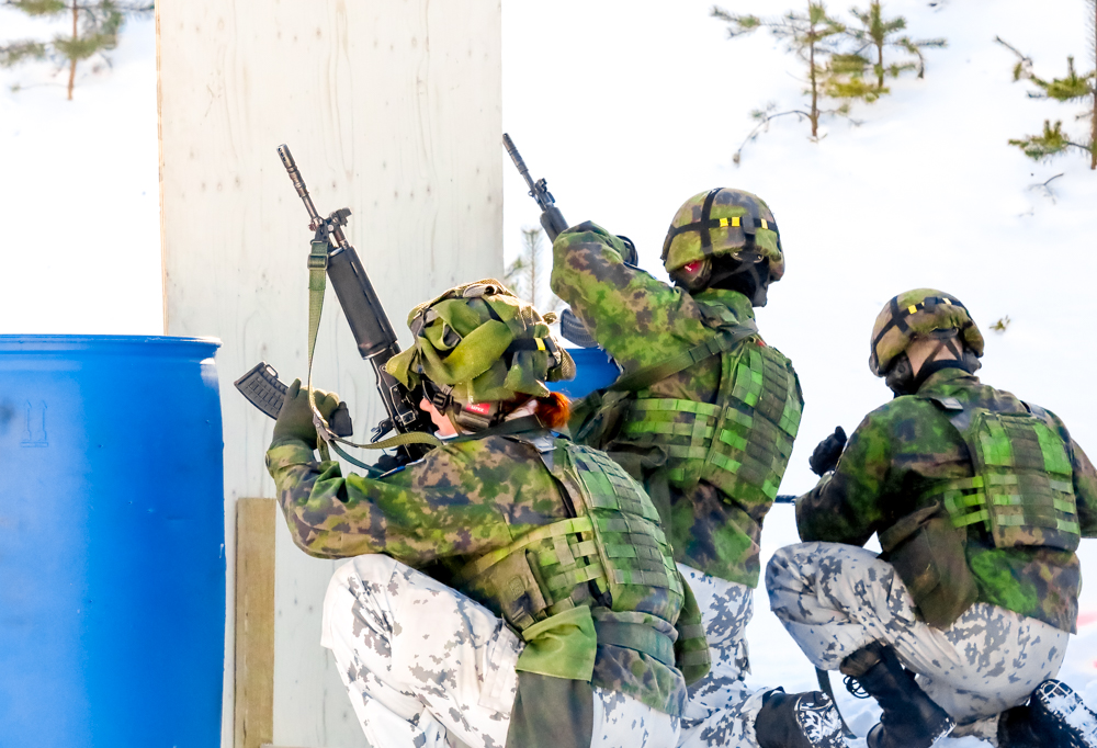 Lounaan jälkeen klo 12:50 tapaamme kadetit majoitusrakennuksen ulkopuolella. Sisäoppitunnilla päällä olleet puvut ovat vaihtuneet taisteluvarustukseen ja läppärit rynnäkkökivääreihin.