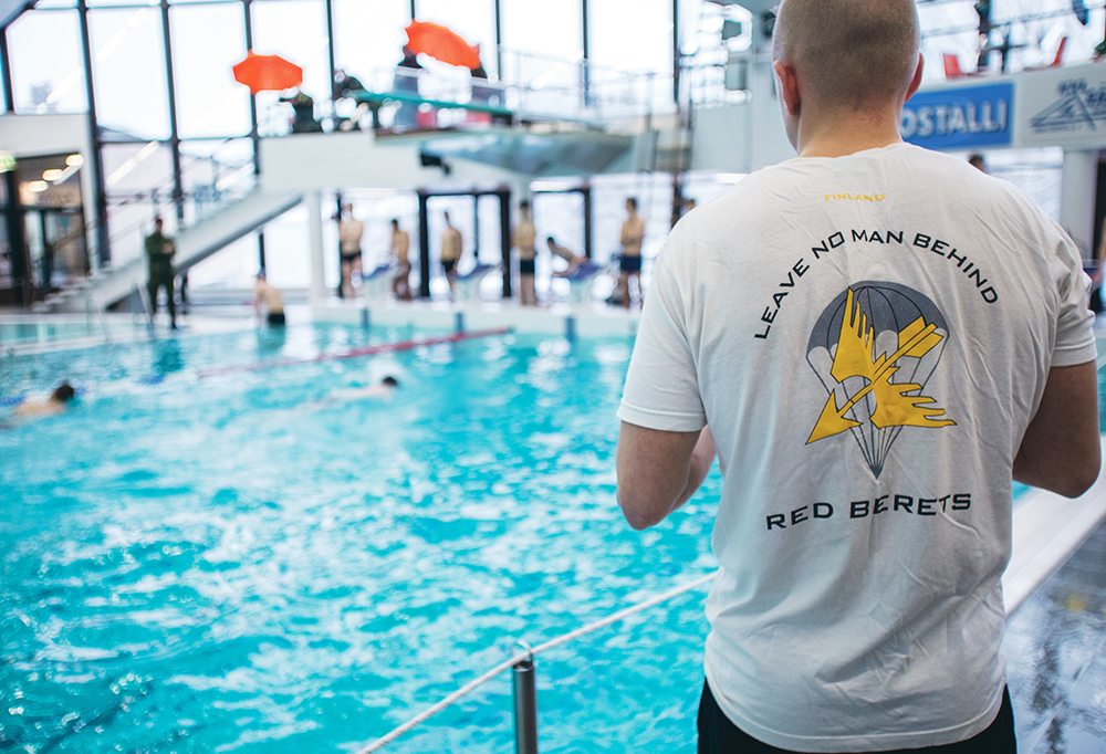 Sukelluksen jälkeen vuorossa on 200 metrin uinti. Laskuvarjojääkäriksi mielivän tulee uida matka neljässä minuutissa ja neljässäkymmenessäviidessä sekunnissa. Osaston ensimmäinen tulee maaliin jo kaksi minuuttia aiemmin, mutta viimeinen koskettaa seinää viimeisellä sekunnilla.