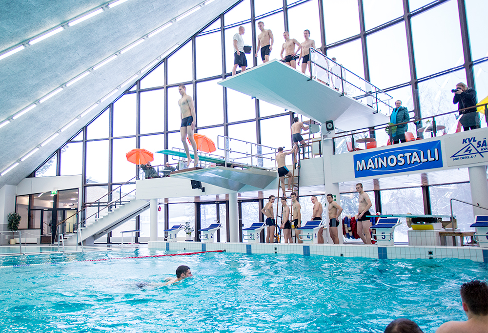 Reppujuoksun jälkeen oli sukellustestin vuoro. Hyppy suoritettiin viidestä metristä jalat edellä. Sukelluksen jälkeen altaan pohjasta tuli noutaa kaksi rengasta.