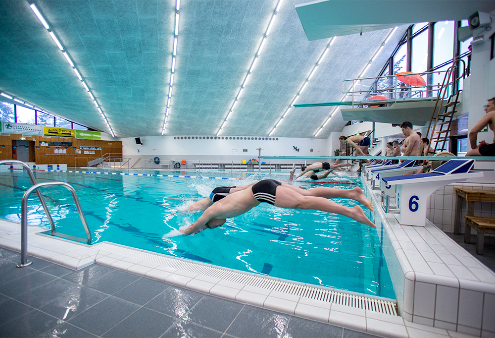 Hypyn jälkeen vuorossa on sukellus altaan pohjaan. Osastosta kaikki nostavat pintaan kaksi rengasta ja ojentavat ne valvojalle.