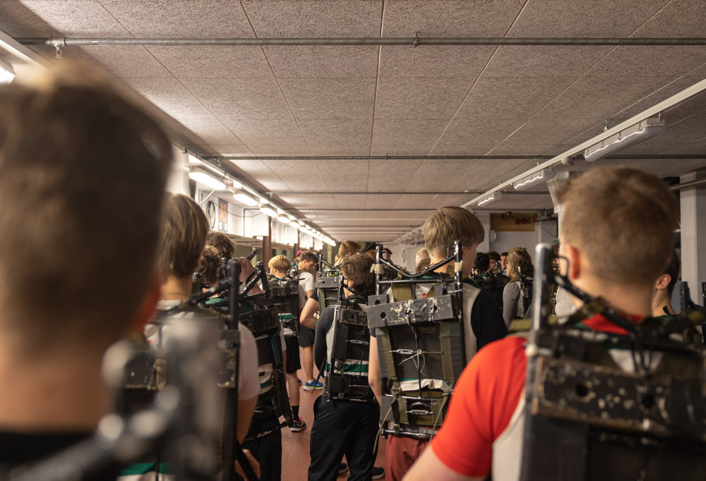 Vääpeli Smeds komentaa osallistujat kolmiriviin. Ohjeistus on selkeä: Ensiksi juostaan kaksi kilometriä lämmittelytahtiin. Sitten vielä kolme kilometriä, josta otetaan aika ja pisteet lasketaan. Kelkan jalaksilta näyttävä “reppu” kiinnitetään selkään ja kiristetään. Repun on tarkoitus mimikoida laskuvarjoreppua.