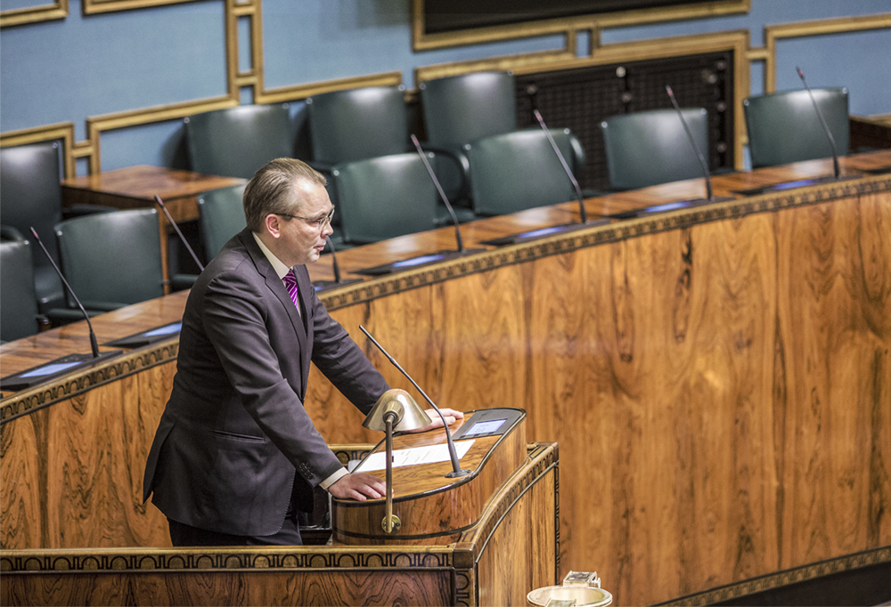 Puolustusministeri Jussi Niinistö (sin.) alusti ajankohtaiskeskustelun. Puheenvuorossaan Niinistö korosti, että vaikka MTS:n tutkimustulos onkin otettava vakavasti, ei tutkimuksesta sen menetelmien ja pienehkön otoksen vuoksi voi vetää pitkälle vietyjä johtopäätöksiä kansalaisten maanpuolustustahdosta.