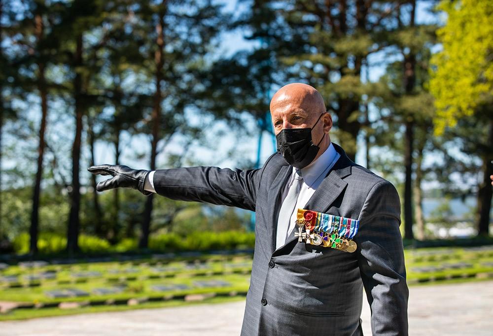 Rauhanturvaajaliiton puheenjohtaja prikaatikenraali evp. Mauri Koskela ei kokenut koronajärjestelyjen vähentävän juhlan tuntua. Kuva: Konsta Törne.