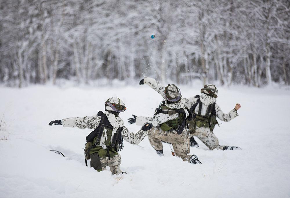 Pakkanen ja kylmä viima eivät ärsyttäneet paikallisia jääkäreitä. Varusmiehet harjoittelivat kranaatin heittämistä.