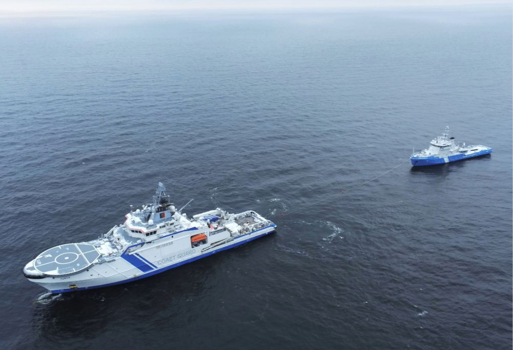 Yli 95 metriä pitkä ulkovartiolaiva Turva on päässyt hinaushommiin. Kuva: Rajavartiolaitos