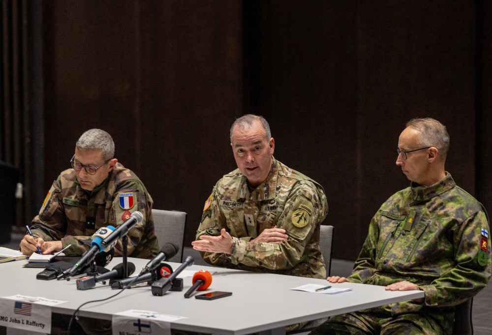 Rovaniemen Jääkäriprikaatin auditoriossa vallitsee rento tunnelma. Paikalla ovat prikaatikenraali Sami-Antti Takamaa, kenraalimajuri (Major General) John L. Rafferty ja prikaatikenraali (Général de brigade) Eric Lendroit.