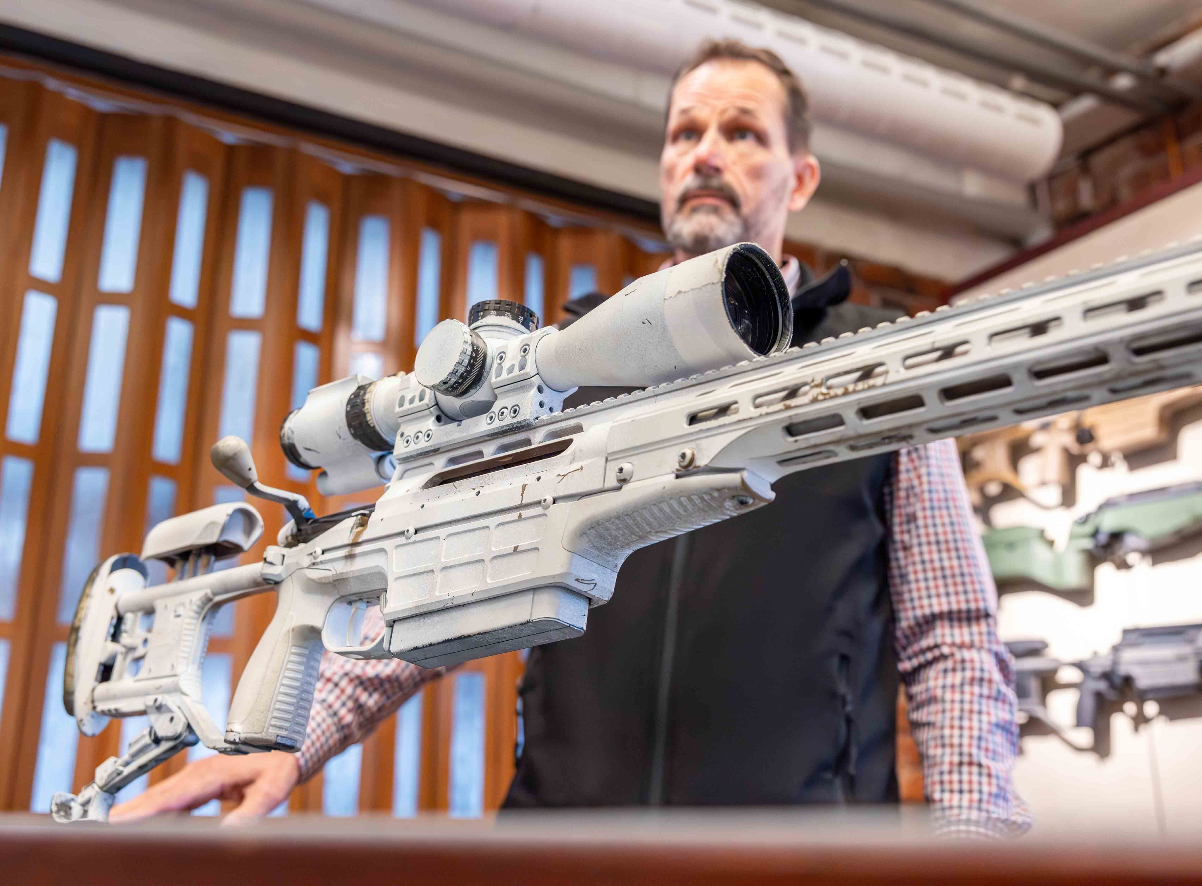 Viranomaisliiketoiminnan johtaja Juuso Austin Sakon TRG-tarkkuuskivääriperheen uusimman mallin kanssa. Kuva: Elias Harinen