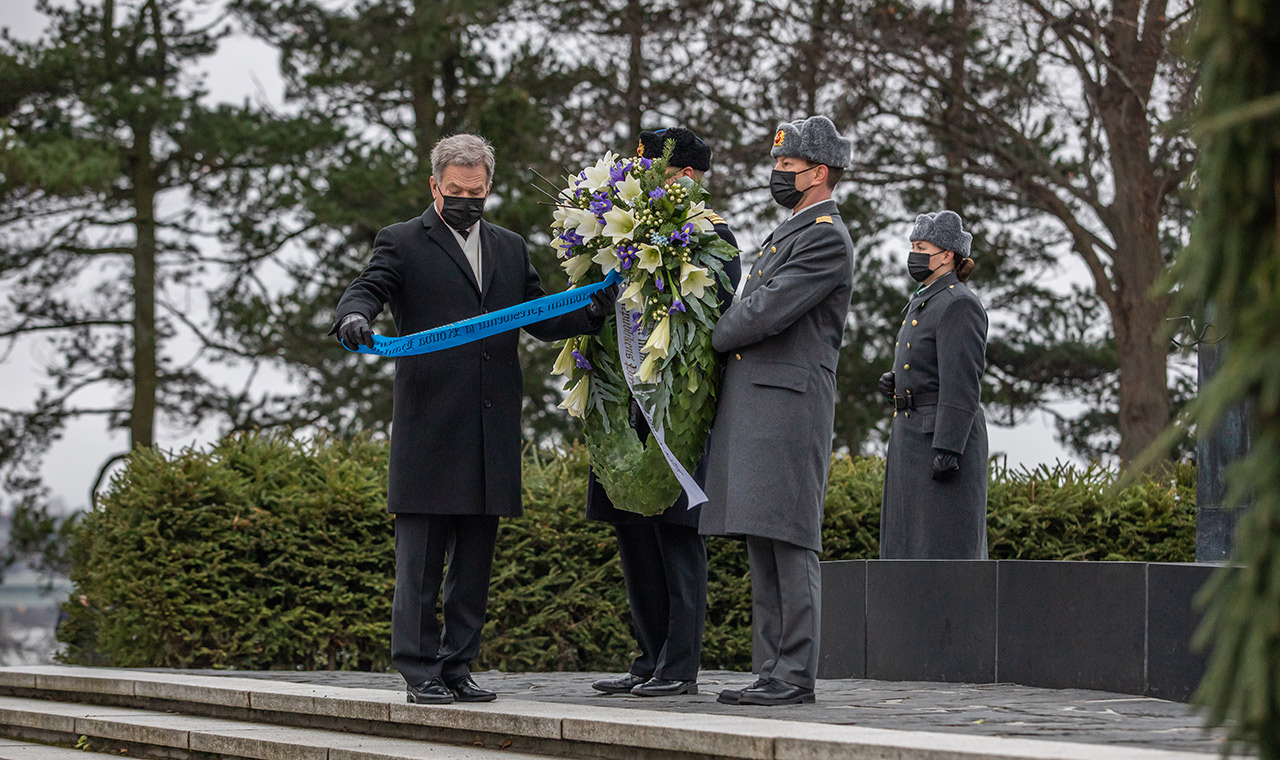 Tämänvuotinen sotilasparaati peruttiin koronan vuoksi, joten myös Porissa laskettiin seppele sankarihaudalle. Sinne ei kuitenkaan Helsingistä ehdi. Hietaniemen seppeleenlasku tapahtuu hautausmaan sankariaukiolla. Siellä on suuri risti ja marsalkka Mannerheimin hauta. Aukiolla sotilassoittokunta ja kunniavartio ovat ryhmittyneet ottamaan vastaan kunniavieraat.