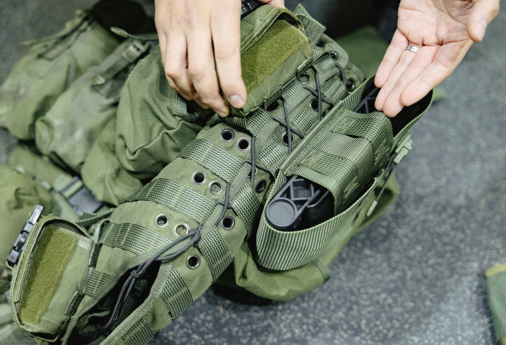 M05-taistelujärjestelmä on monelle varusmiehelle tuttu, mutta kukaan ei tunnu tietävän mihin tarkoitukseen kenttälapiotaskun sivuihin on lisätty Pals-hihnat. Kuva: Karoliina Huopalainen