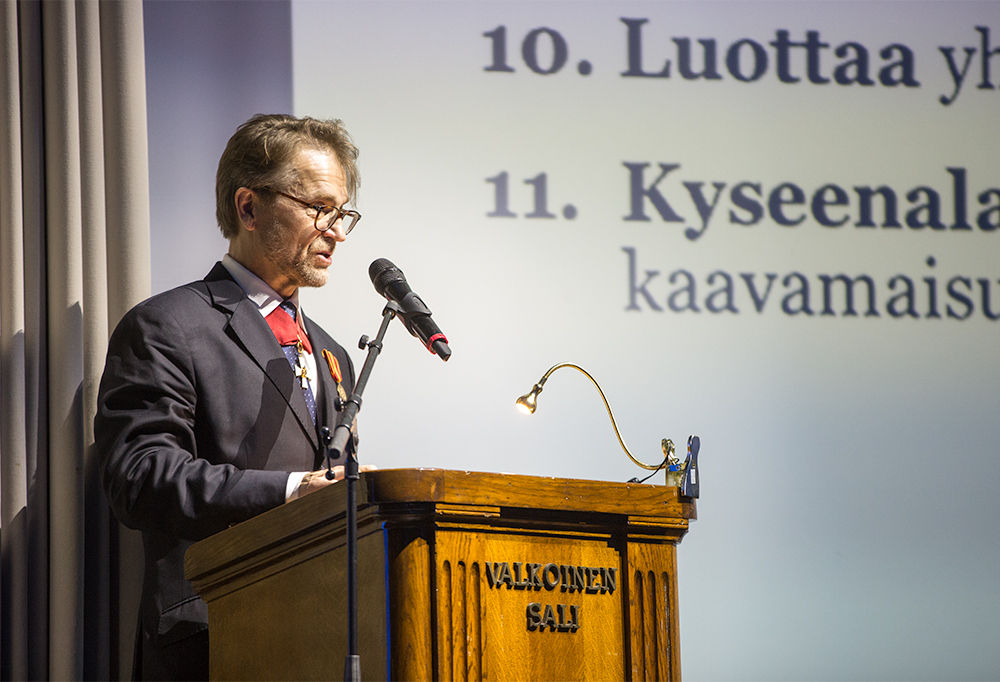 Suomen itsenäisyyden juhlarahaston Sitran yliasiamies Mikko Kosonen kiitteli puolustusvoimien johtamiskoulutusta Pääesikunnan 100-vuotisjuhlassa.