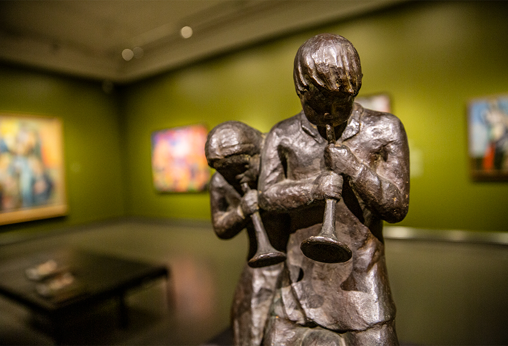 Yngve Bäckin maalaus, Sodan sävel, (1944) on yksi näyttelyn synkimpiä, jylhimpiä ja jollain tavalla pelottavimpia maalauksia. Teoksessa näkyy jatkosodan loppuvaiheen tuhoisat pommitukset kaupunkeihin ja perääntymisen aiheuttama epätoivo. Ankara industriaalinen hahmo soittaa veren punaisena hohtavaa selloa. Teoksen alareunassa ihminen yrittää suojata kuulonsa. Värit ovat kylmät, hyytävät ja toivottomat.