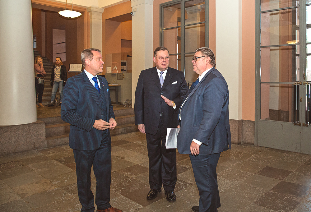 Timo Soini sanoi Maanpuolustuskurssiyhdistyksen tilaisuudessa 19. lokakuuta asevalvonnan merkityksen kohonneen maailmanpoliittisen tilanteen ollessa kireä.