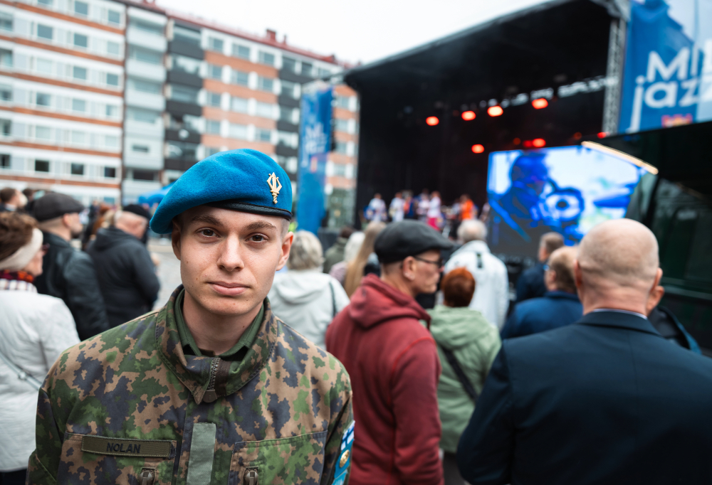 – Säästä huolimatta paikalla on paljon väkeä ja tunnelma on tosi hyvä, Parolan varusmiessoittokunnan kitaristi iloitsee.