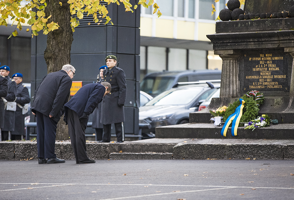 Seppeleet laskeutuivat Kaartin kasarmin pihalla olevan muistomerkin eteen. Bulgarian Plevenissä käydystä Gornyi Dubnjakin -taistelusta tuli kuluneeksi 24. lokakuuta 140 vuotta. Taistelun kunniaksi on pystytetty muistomerkit niin Suomeen kuin Bulgariaan. Kaartin kasarmin pihalla olevassa muistomerkissä on taisteluissa kaatuneen 24 suomalaissotilaan nimet.