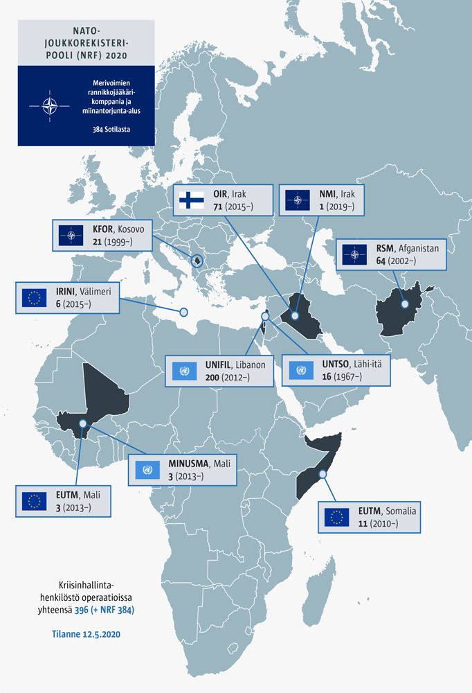 Tällä hetkellä Suomi osallistuu yhteensä kymmeneen sotilaallisen kriisinhallinnan operaatioon. Operaatiokohtainen skaala on hyvin laaja ja kontrastit eri maiden välillä suuria. Suomen suurin henkilömääräinen panostus on ollut jo vuosia Etelä-Libanonin UNIFIL:issa. Suomi on ottanut osaa tähän YK-johtoiseen operaatioon neljällä eri vuosikymmenellä ja tällä hetkellä Libanonissa palvelee 200 suomalaista.
