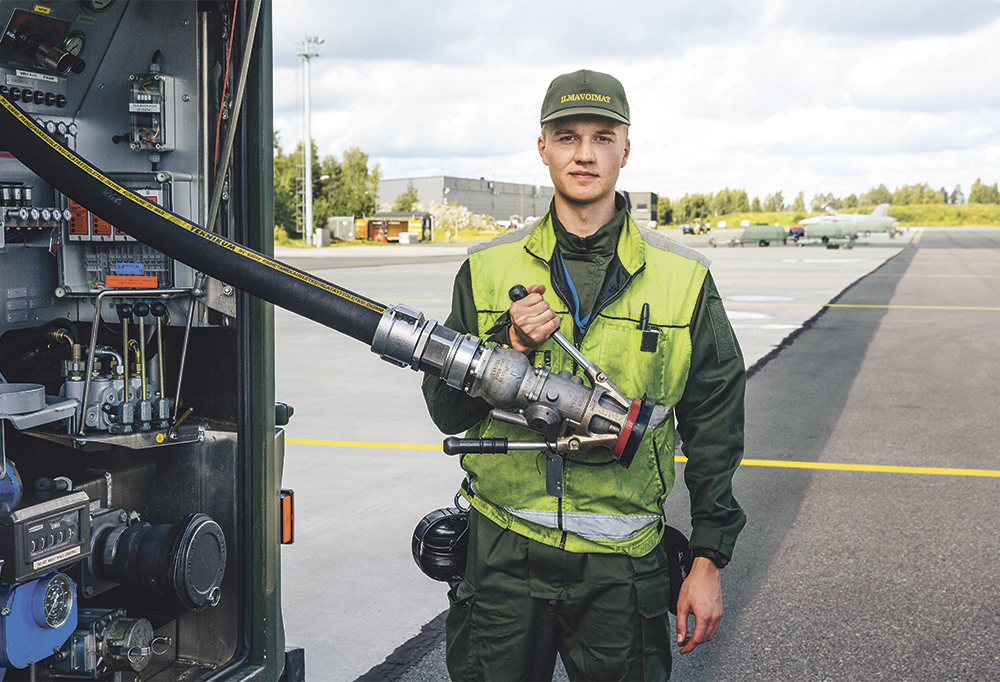 Hornet-hävittäjät nousevat ja laskeutuvat Karjalan lennoston lentokentällä. Laivuekuljettajien tehtävänä on huolehtia, että jokainen Hornet on tankattu ja valmiina lentokierrosta varten.