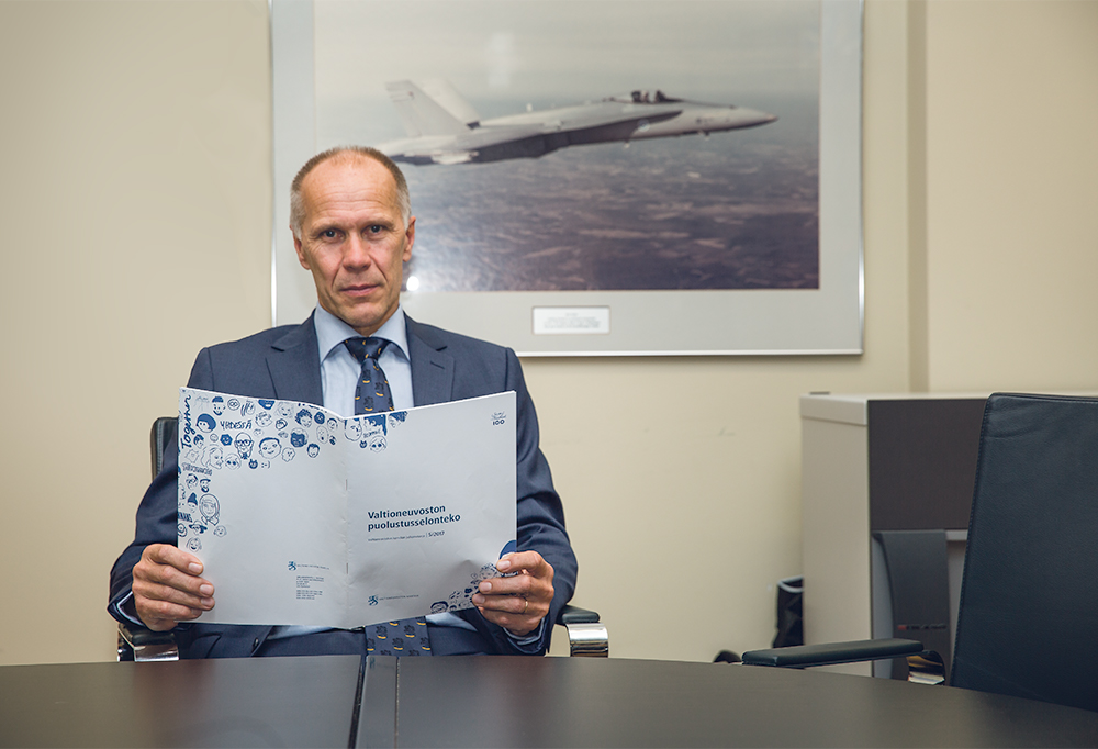 – Lentokoneidemme alasampuminen on helpointa nyt, ennen kuin niitä on ostettu. Mitä vähemmän Suomi ostaa hävittäjiä, sitä vähemmän meillä on suorituskykyä. Saattaa olla, että tätäkin keinoa joku taho pyrkii käyttämään hyväksi, Lauri Puranen pohtii kädessään puolustusselonteko. Kenraalimajuri evp. Puranen on aiemmin toiminut muun muassa ilmavoimien komentajana.