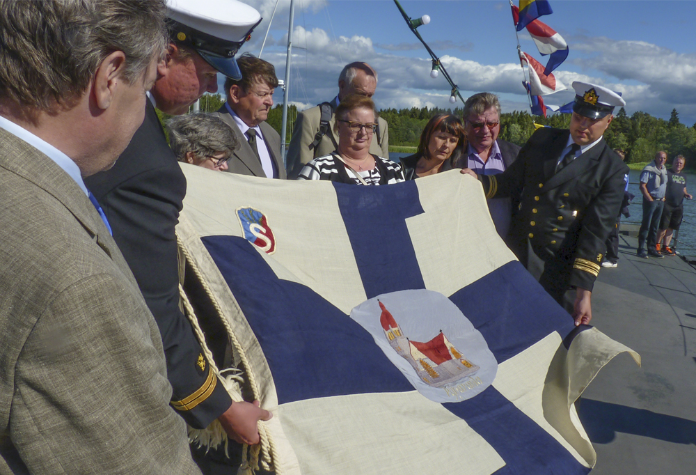 Löytyneen suojeluskuntalipun otti vastaan miinalautta Pyhärannan päällikkö, kapteeniluutnantti Tuomas Huolman.