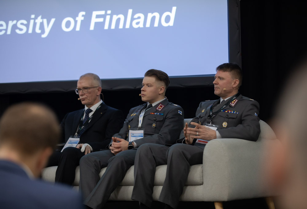 Dosentti Juha Honkonen (vas.), majuri Antti Paronen sekä everstiluutnantti Aki-Mauri Huhtinen Maanpuolustuskorkeakoulusta analysoivat Ukrainan sodan oppeja. Kuva: Julius Numminen