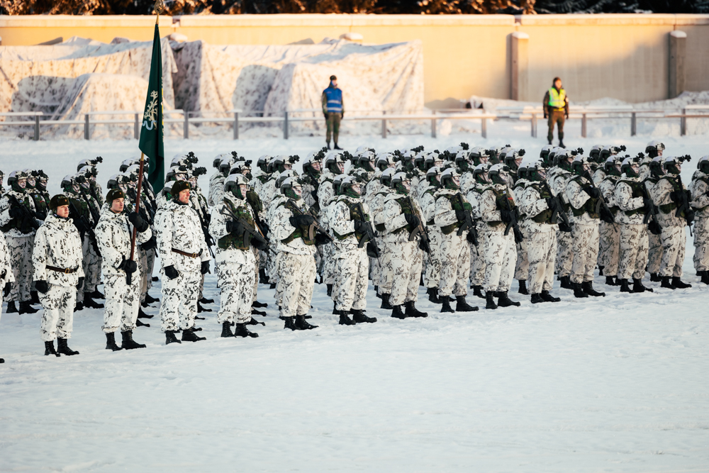 Lumipuvut hohtavat taistelijoiden marssiessa paraatin vastaanottajien ohi. Kuva: Eeli Gröhn