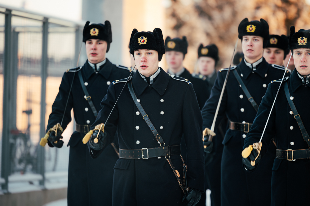 Maanpuolustuskorkeakoulun kadetit marssivat miekkojensa kanssa. Kuva: Eeli Gröhn