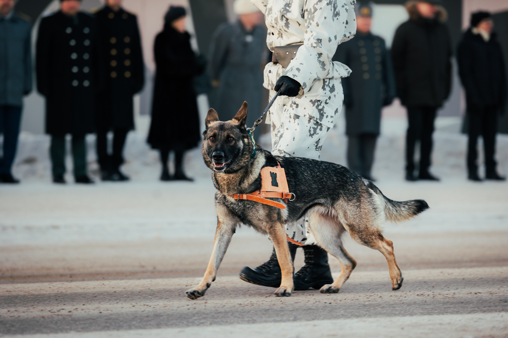 Porin prikaati oli ottanut myös sotakoiria paraatiin. Kuva: Eeli Gröhn
