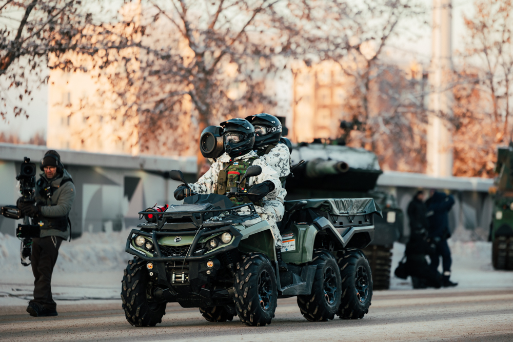 Kuusipyöräisen Polaris Sportsman 6X6 -mönkijän kyytiin mahtuu kaksi, ja myös NLAW-lähipanssarintorjuntaohjus olalle. Kuva: Eeli Gröhn